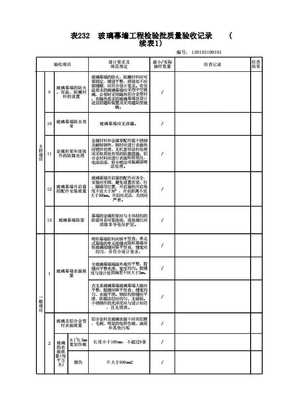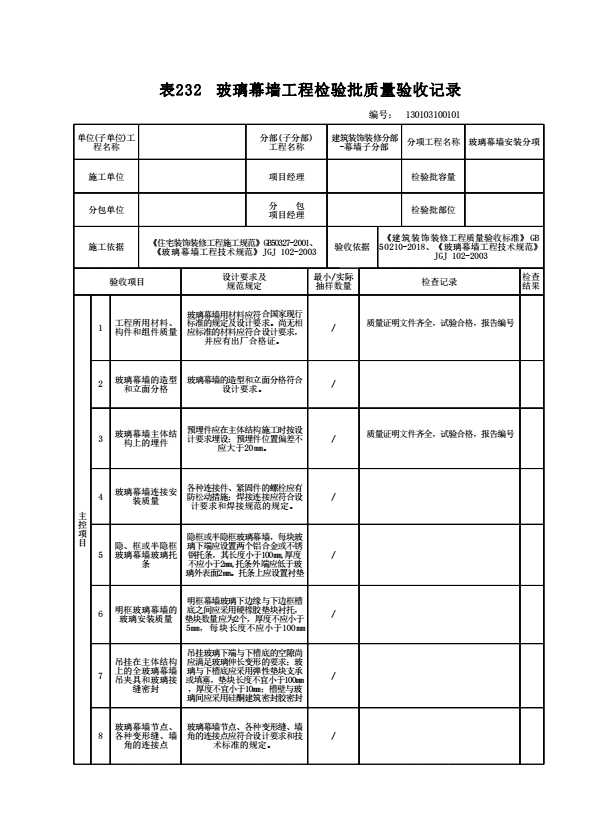 表格名称:010103100101 玻璃幕墙工程检验批质量验收记录