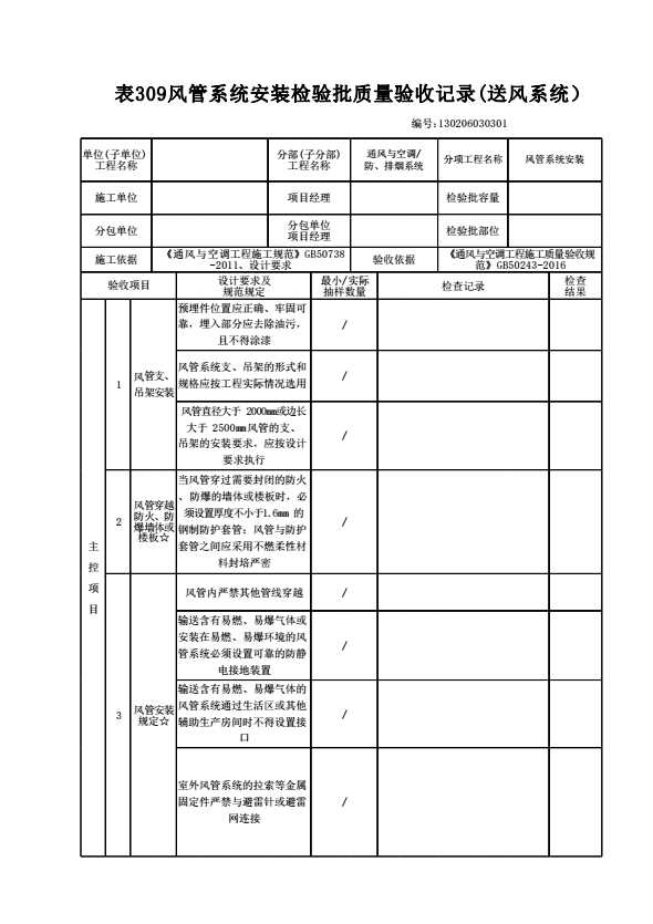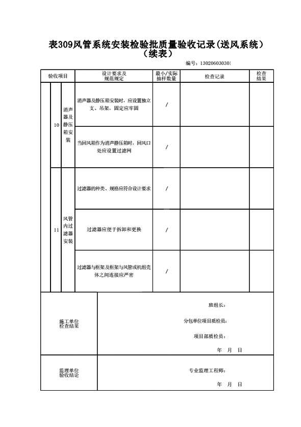 表格名称:130206030301 风管系统安装检验批质量验收记录(送风系统)
