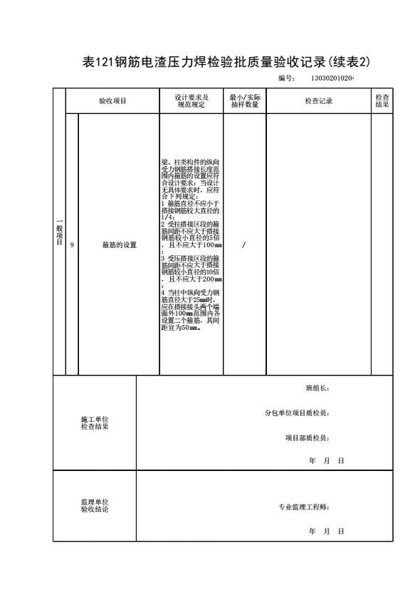 表格名称:130302010204 钢筋电渣压力焊检验批质量验收记录
