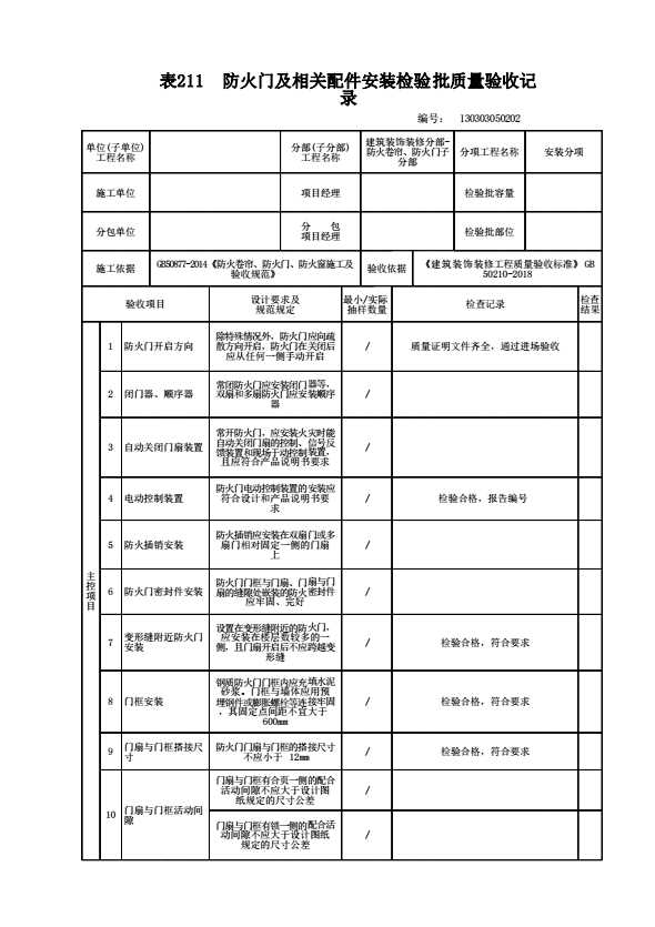130303050202 防火门及相关配件安装检验批质量验收记录