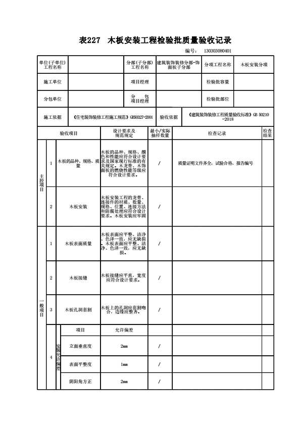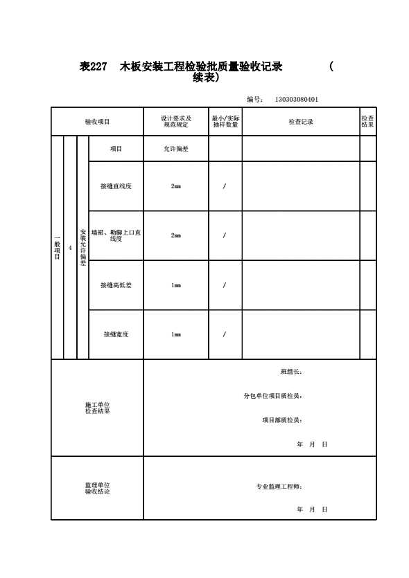 表格名称:130303080401 木板安装工程检验批质量验收记录