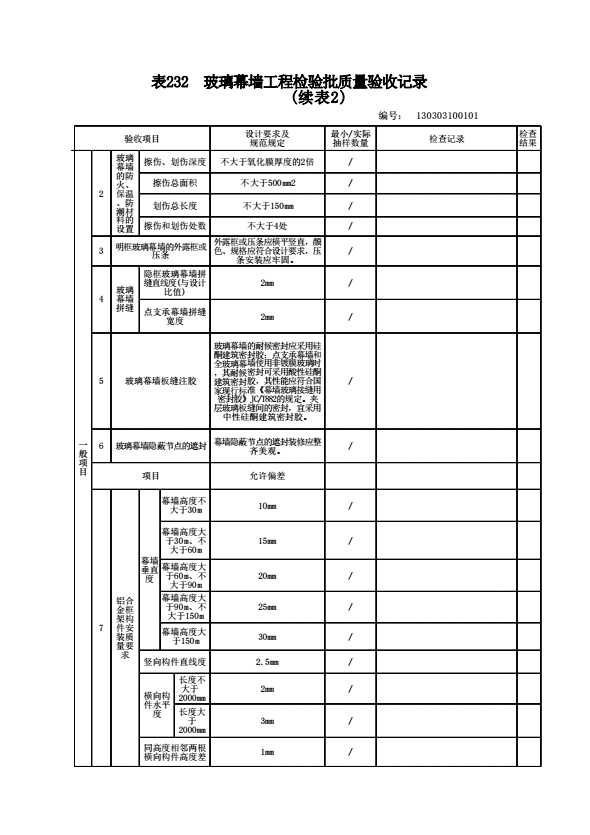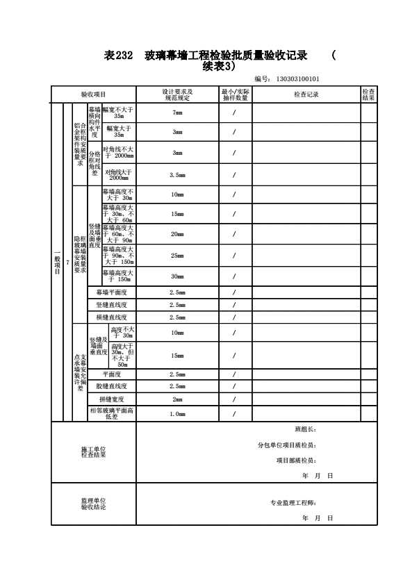 表格名称:130303100101 玻璃幕墙工程检验批质量验收记录