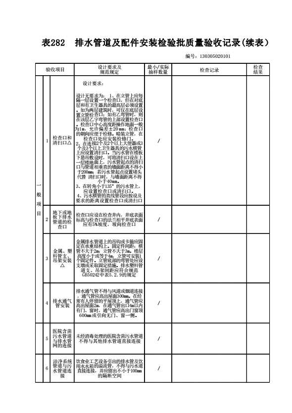 表格名称:130305020101 排水管道及配件安装检验批质量验收记录