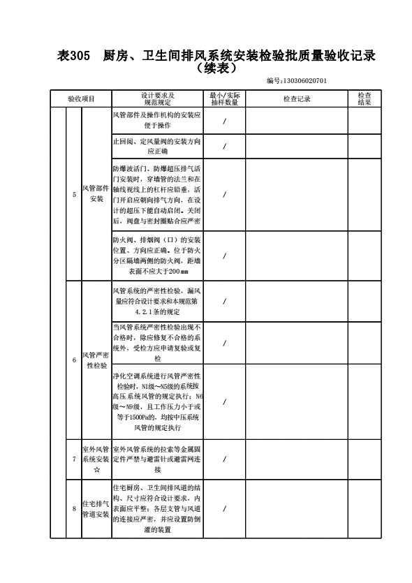 表格名称:130306020701 厨房、卫生间排风系统安装检验批质量验收记录
