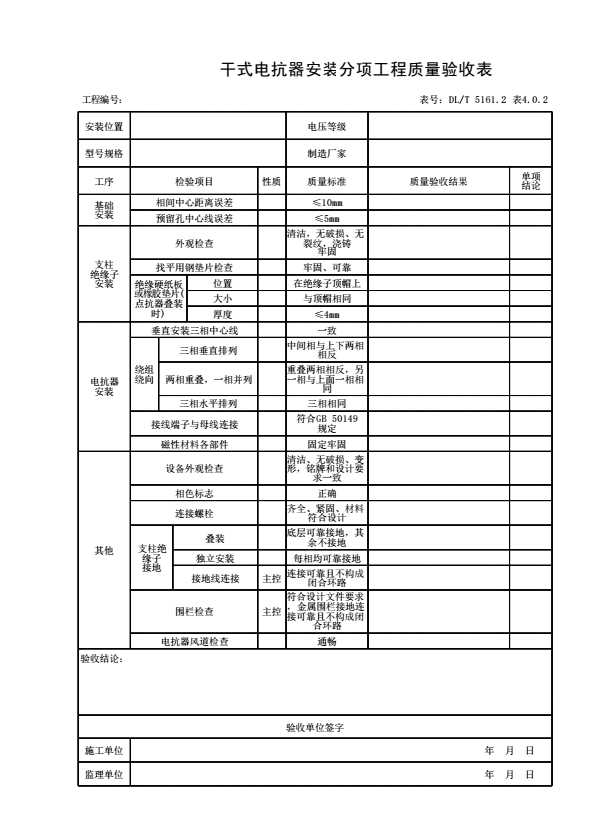 表格名称:表4.0.2 干式电抗器安装分项工程质量验收表