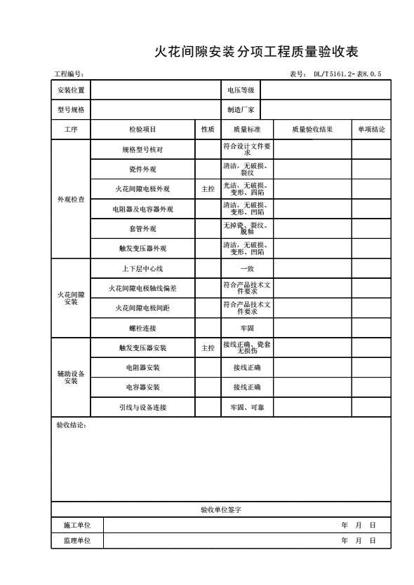 表格名称:表8.0.5 火花间隙安装分项工程质量验收表