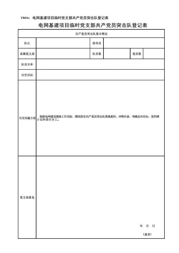 YDJ4:电网基建项目临时党支部共产党员突击队登记表