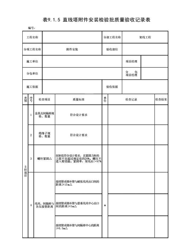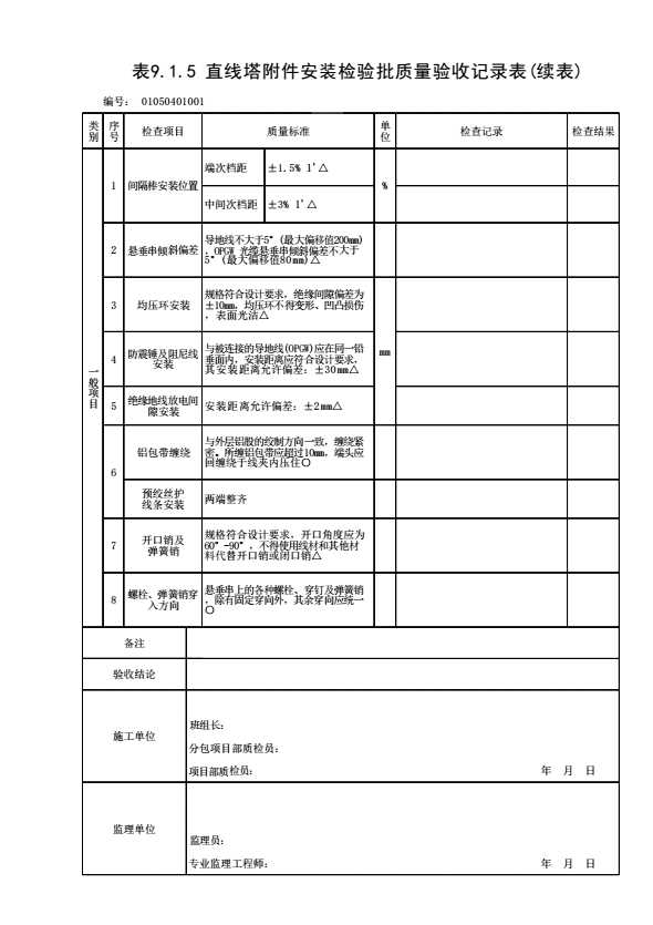 表格名称:表9.1.5 直线塔附件安装检验批质量验收记录表