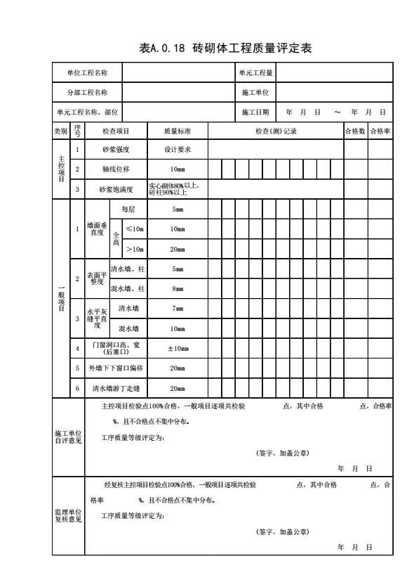 表格名称:表A.0.18 砖砌体工程质量评定表