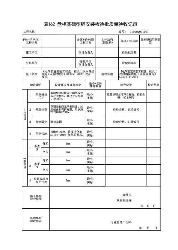 表格名称:010102031001 盘柜基础型钢安装检验批质量验收记录