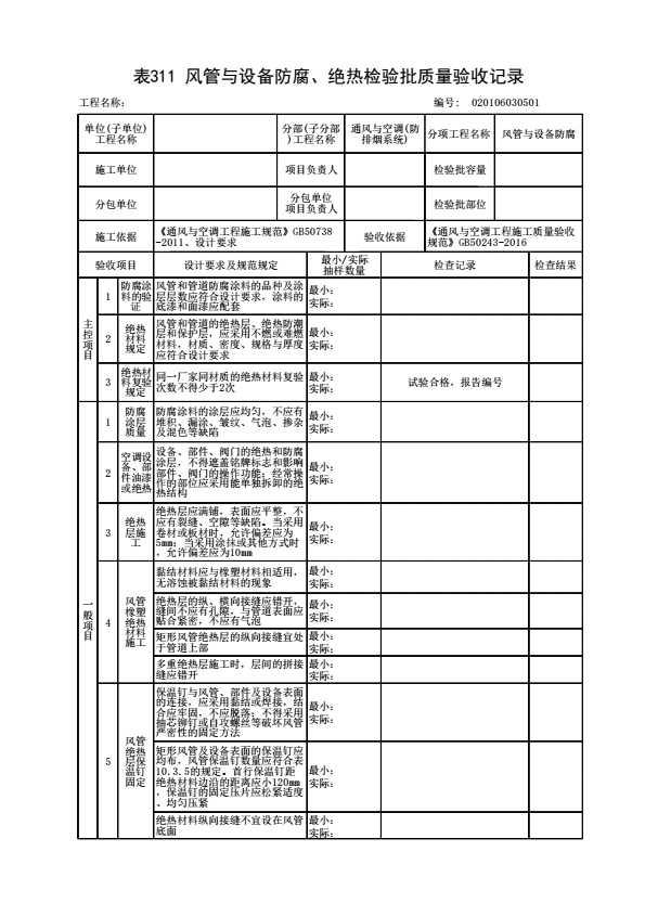 020106030501 风管与设备防腐、绝热检验批质量验收记录