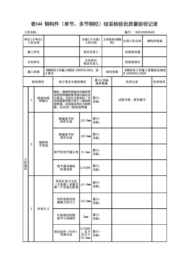 表格名称:050102030401 钢构件(单节、多节钢柱)组装检验批质量验收记录