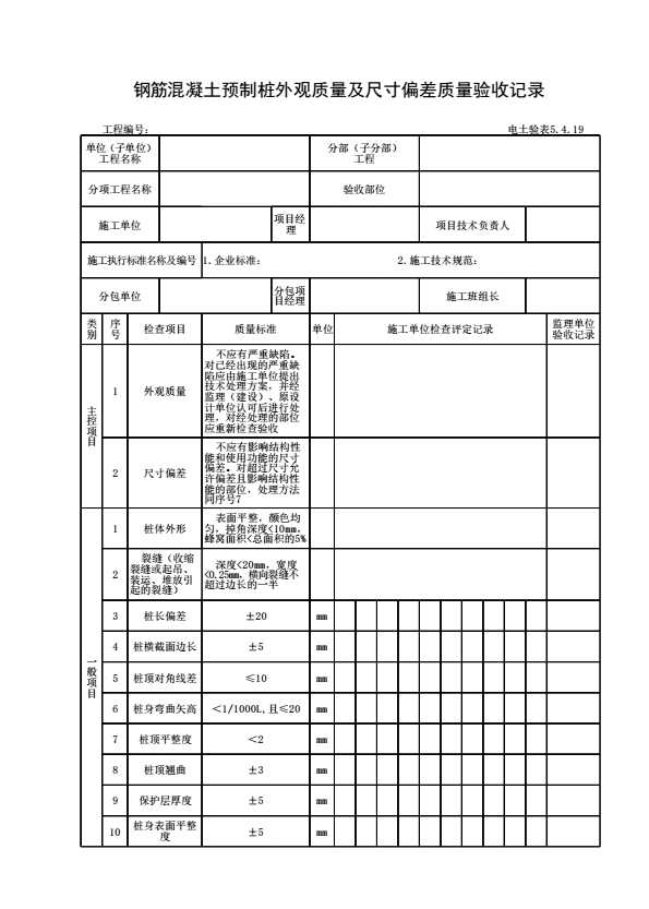 表格名称:电土验表5.4.19 钢筋混凝土预制桩外观质量及尺寸偏差质量验收记录