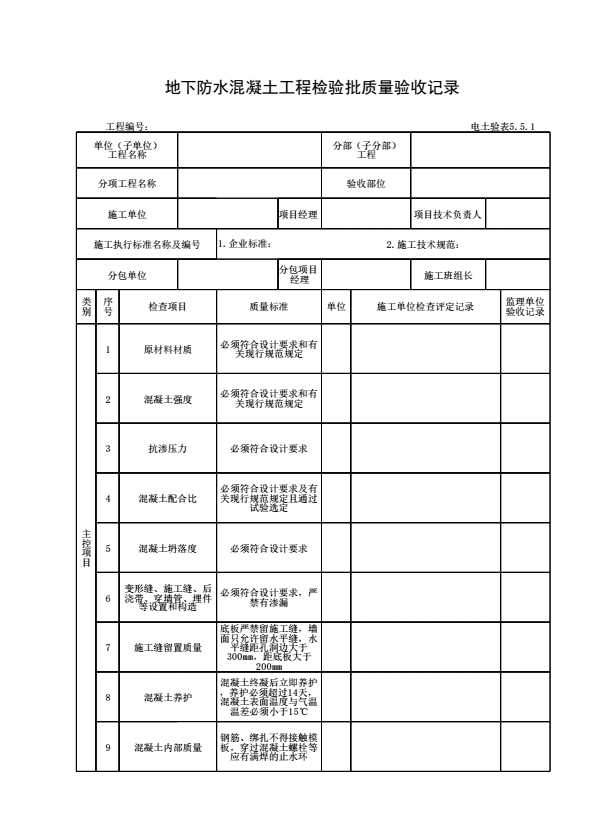 表格名称:电土验表5.5.1 地下防水混凝土工程检验批质量验收记录