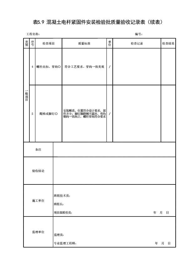 表格名称:表5.9 混凝土电杆紧固件安装检验批质量验收记录表
