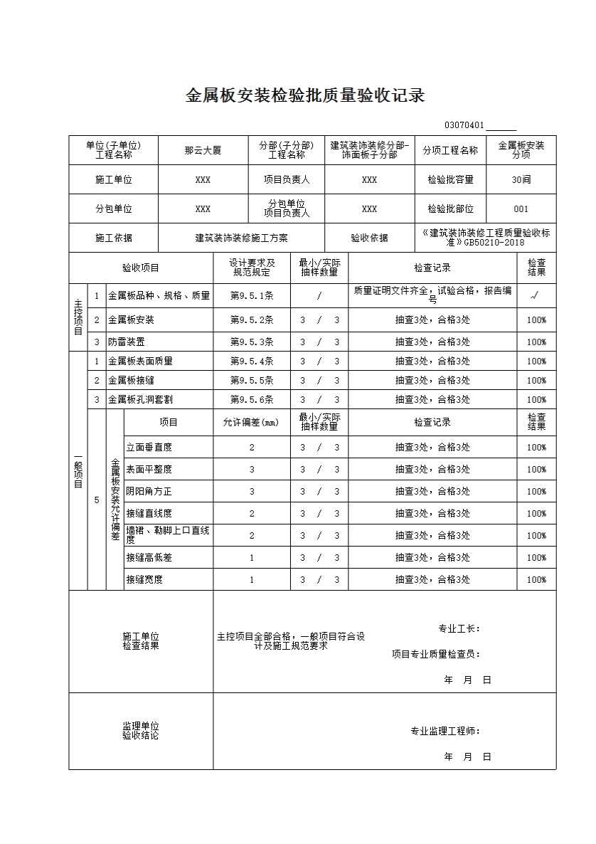 金属板安装检验批质量验收记录
