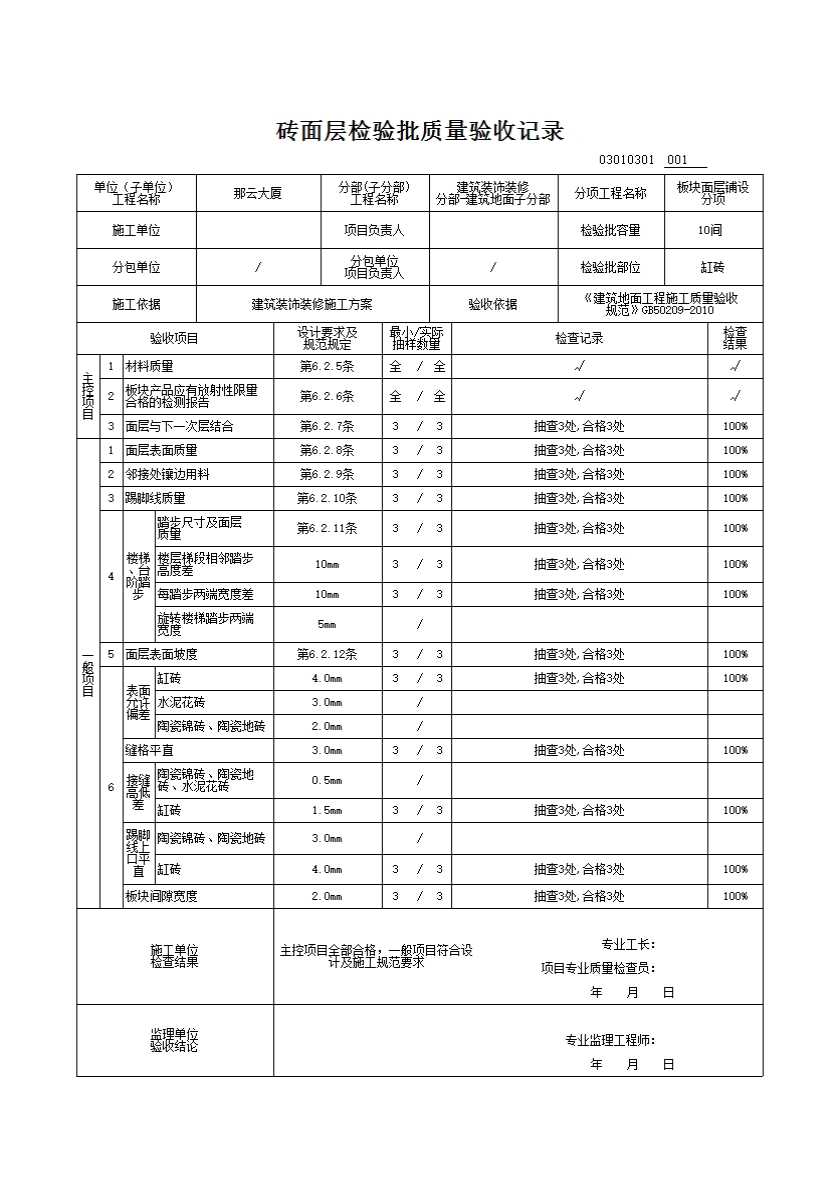 3.0.22 建筑地面工程的分项工程施工质量检验的主控项目,应达到本规范规定的质量标准,认定为合格;一般项目80%以上的检查点(处)符合本规范规定的质量要求,其他检查点(处)不得有明显影响使用,且最大偏差值不超过允许偏差值的50%为合格。