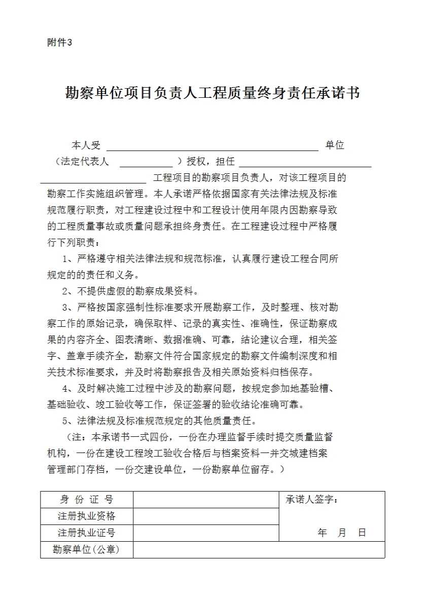 表格名称:附件3 勘察单位项目负责人工程质量终身责任承诺书