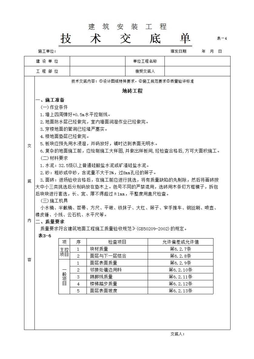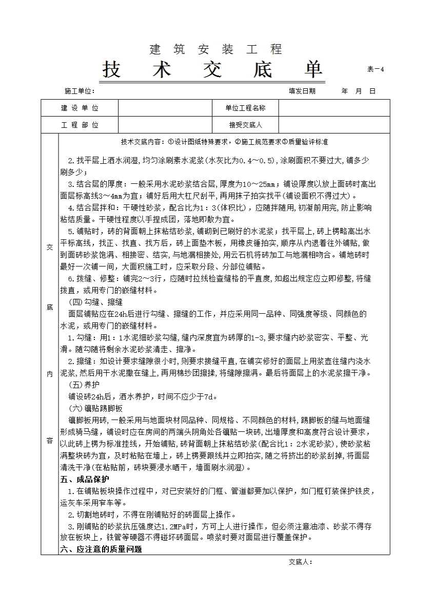 表格名称:地砖工程