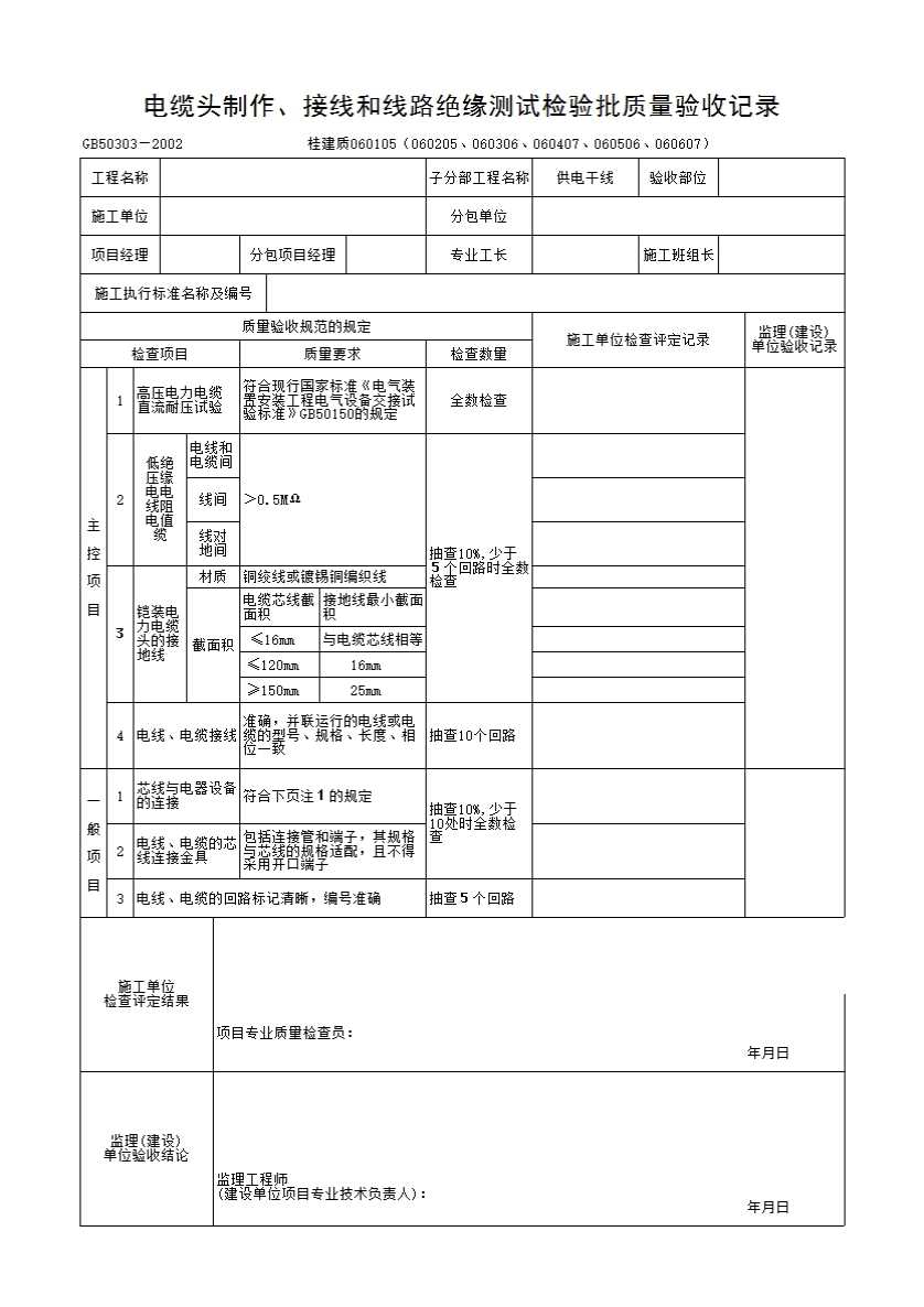 表格名称:电缆头制作、接线和线路绝缘测试检验批质量验收记录060306