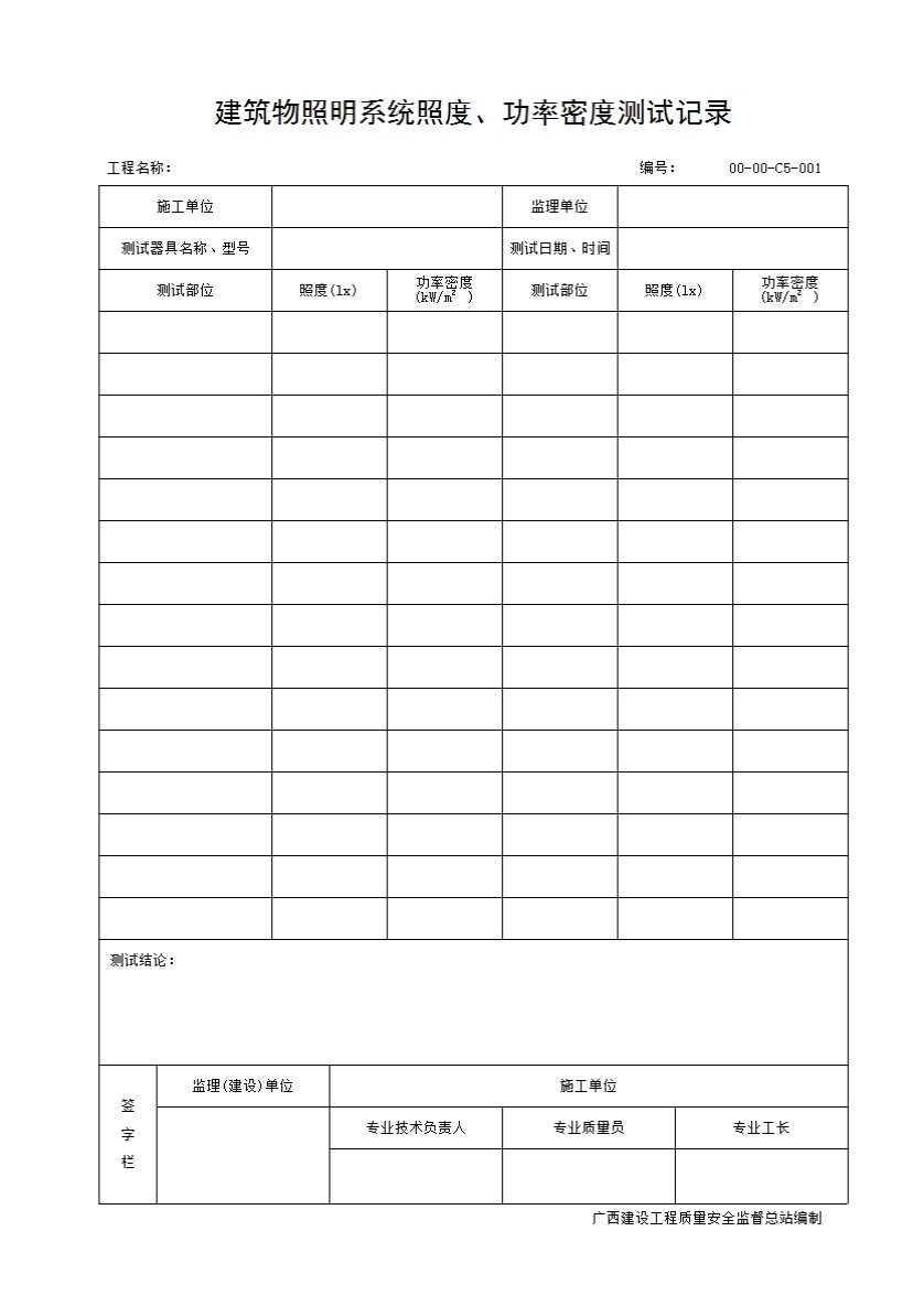 表格名称:建筑物照明系统照度、功率密度测试记录
