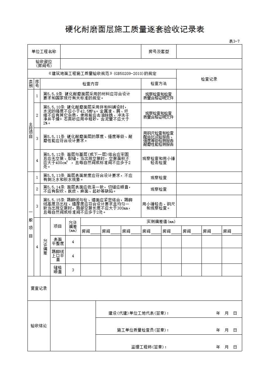 表格名称:表3-7 硬化耐磨面层施工质量逐套验收记录表