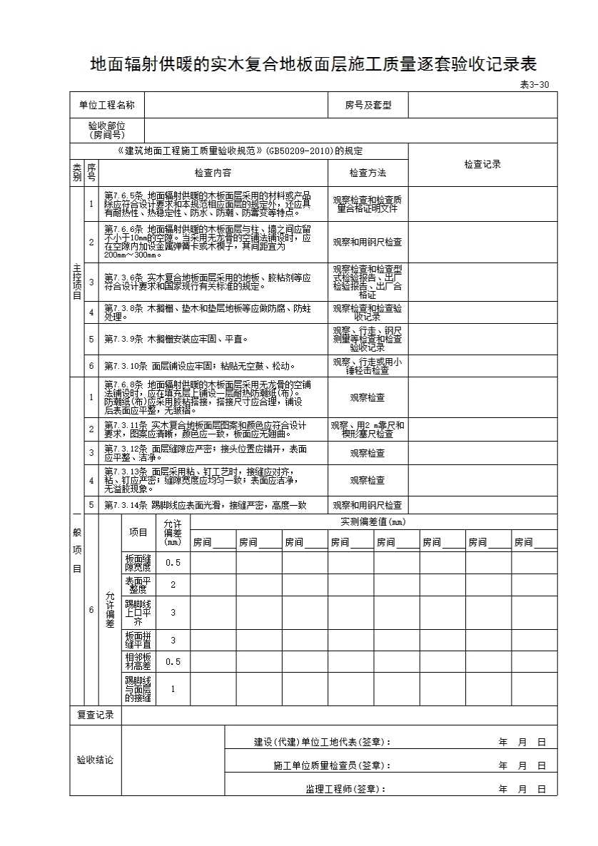 表格名称:表3-30 地面辐射供暖的实木复合地板面层施工质量逐套验收记录表