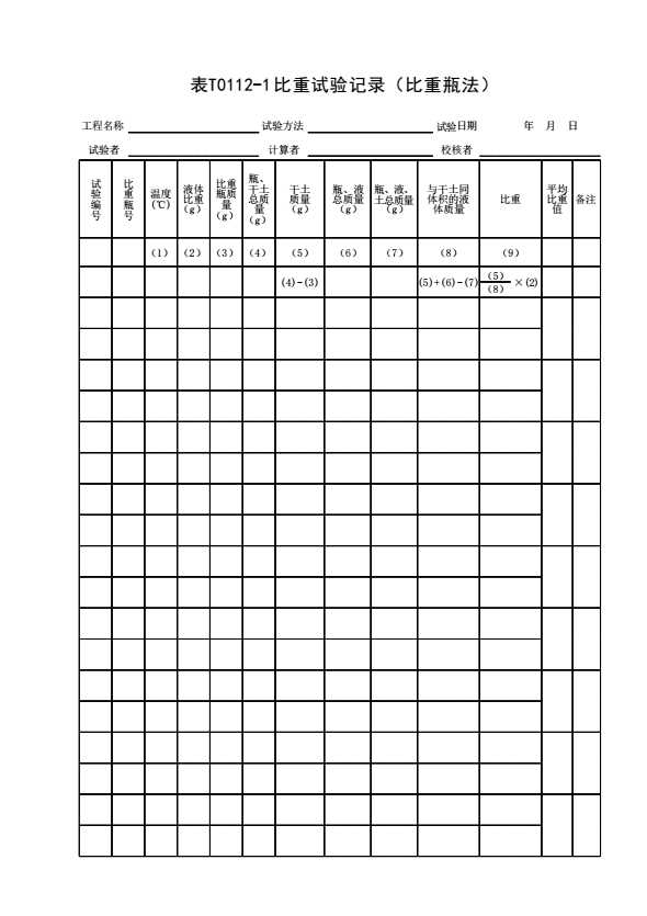 表格名称:表T0112-1 比重试验记录(比重瓶法)