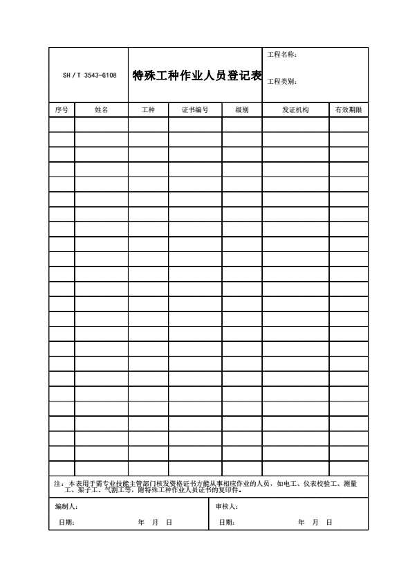 表格名称:SH/T 3543-G108 特殊工种作业人员登记表
