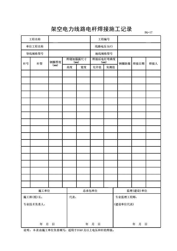 表格名称:DQ-17 架空电力线路电杆焊接施工记录