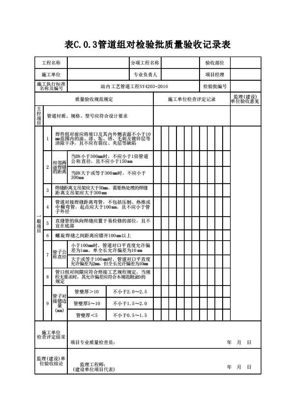 表格名称:表C.0.3 管道组对检验批质量验收记录表.