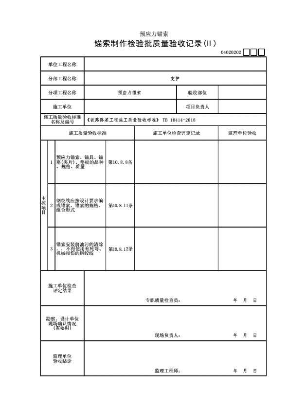 表格名称:04020202 【预应力锚索】锚索制作检验批质量验收记录(Ⅱ)