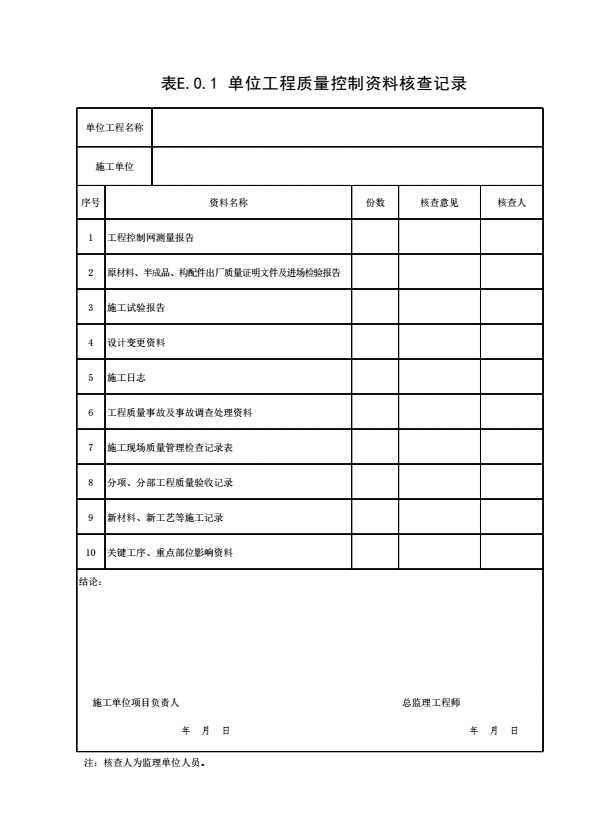 表格名称:表E.0.1 单位工程质量控制资料核查记录