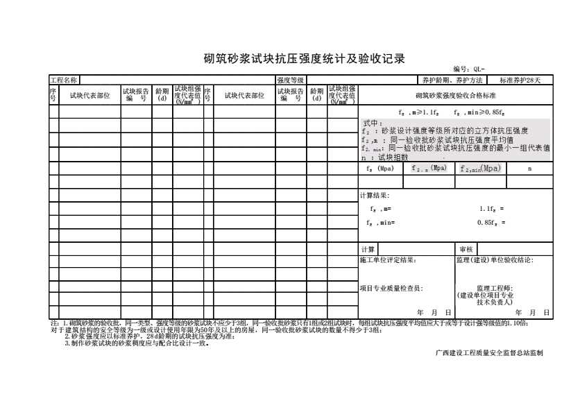 表格名称:砌筑砂浆试块抗压强度统计及验收记录【2组以上】