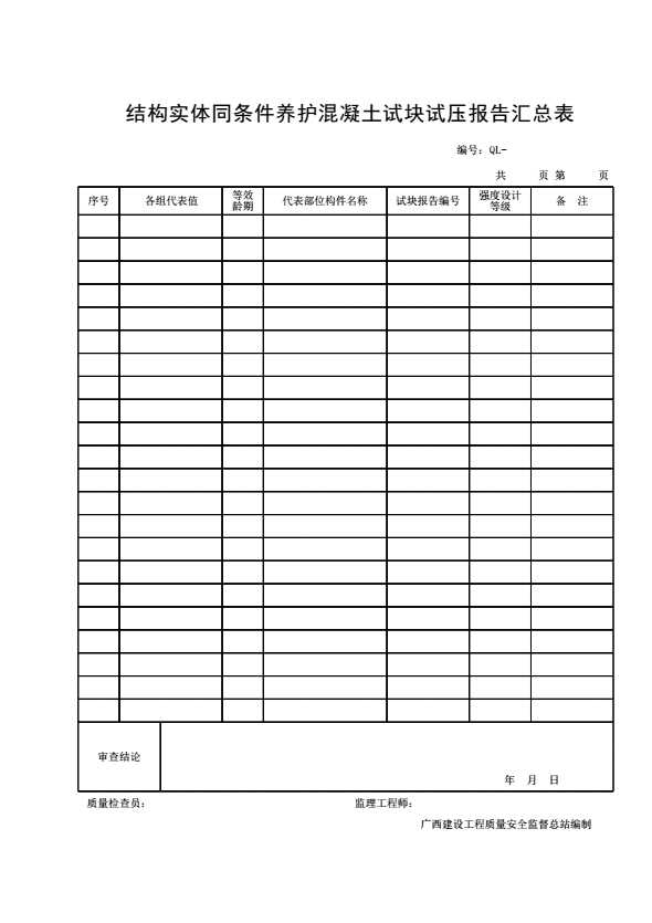 表格名称:结构实体同条件养护混凝土试块试压报告汇总表