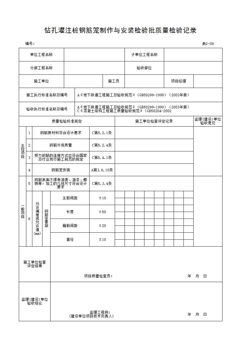表格名称:表G-08 钻孔灌注桩钢筋笼制作与安装检验批质量检验记录