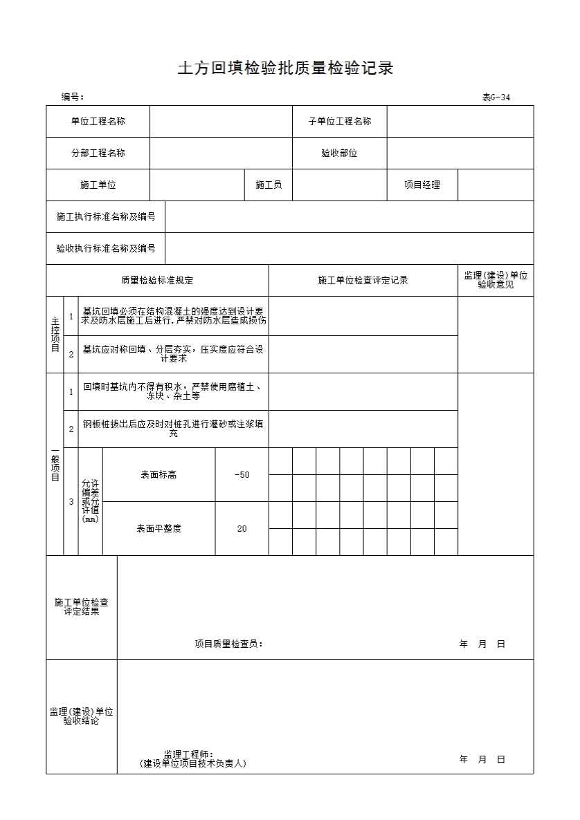 表格名称:表G-34 土方回填检验批质量检验记录