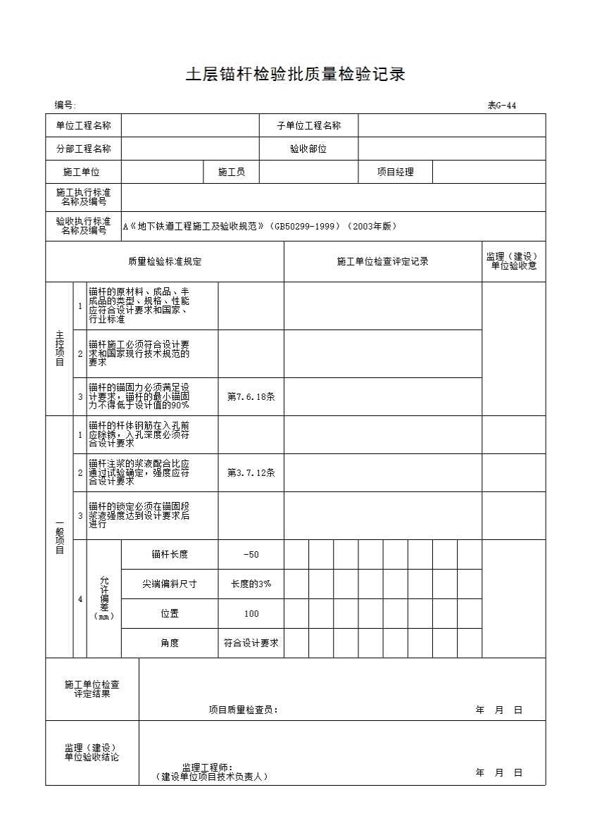 表格名称:表G-44 土层锚杆检验批质量检验记录
