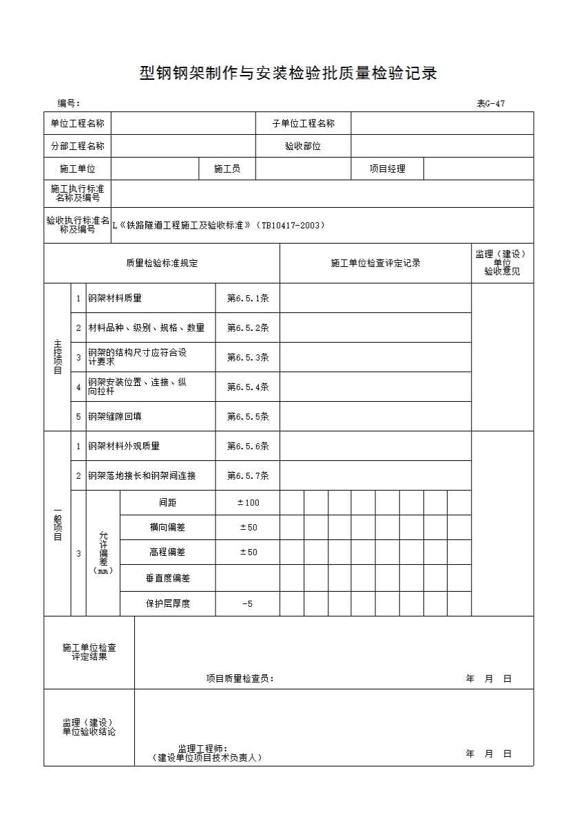 表格名称:表G-47 型钢钢架制作与安装检验批质量检验记录