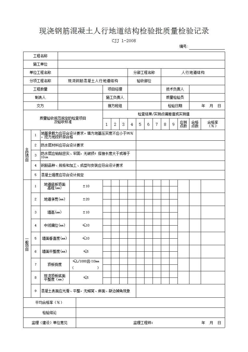 表格名称:现浇钢筋混凝土人行地道结构检验批质量检验记录