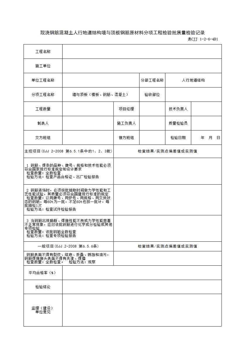 表格名称:表CJJ 1-2-6-4B1 现浇钢筋混凝土人行地道结构墙与顶板钢筋原材料分项工程检验批质量检验记录