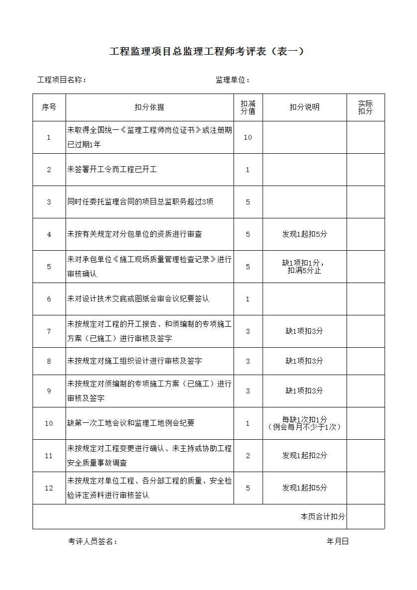 表格名称:表一工程监理项目总监理工程师考评表