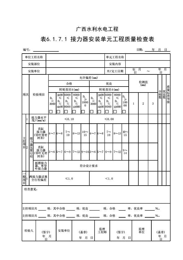 表格名称:表6.1.7.1 接力器安装单元工程质量检查表
