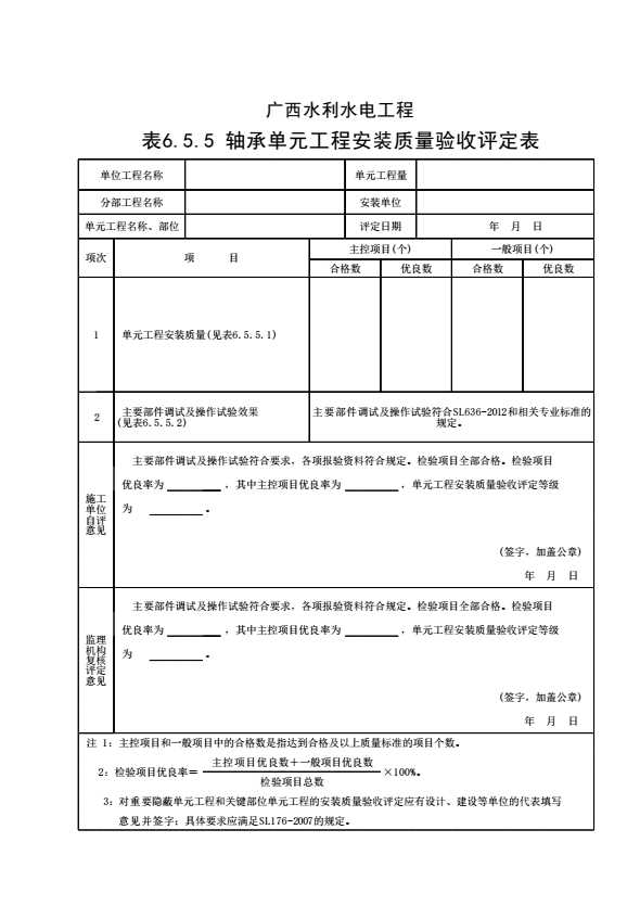 表6.5.5 推力轴承和导轴承单元工程安装质量验收评定表填表说明