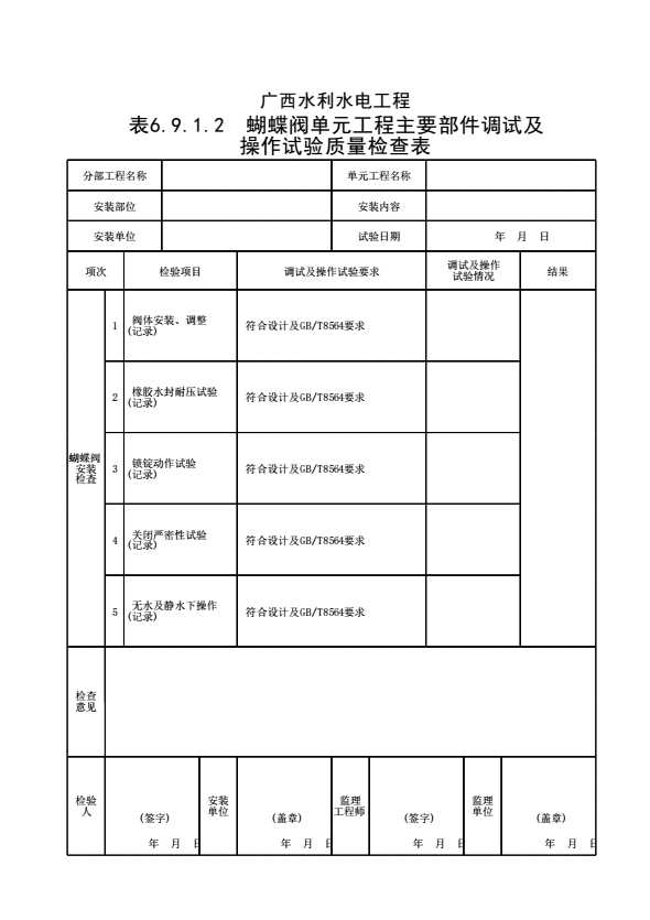 表格名称:表6.9.1.2 蝴蝶阀单元工程主要部件调试及操作试验质量检查表
