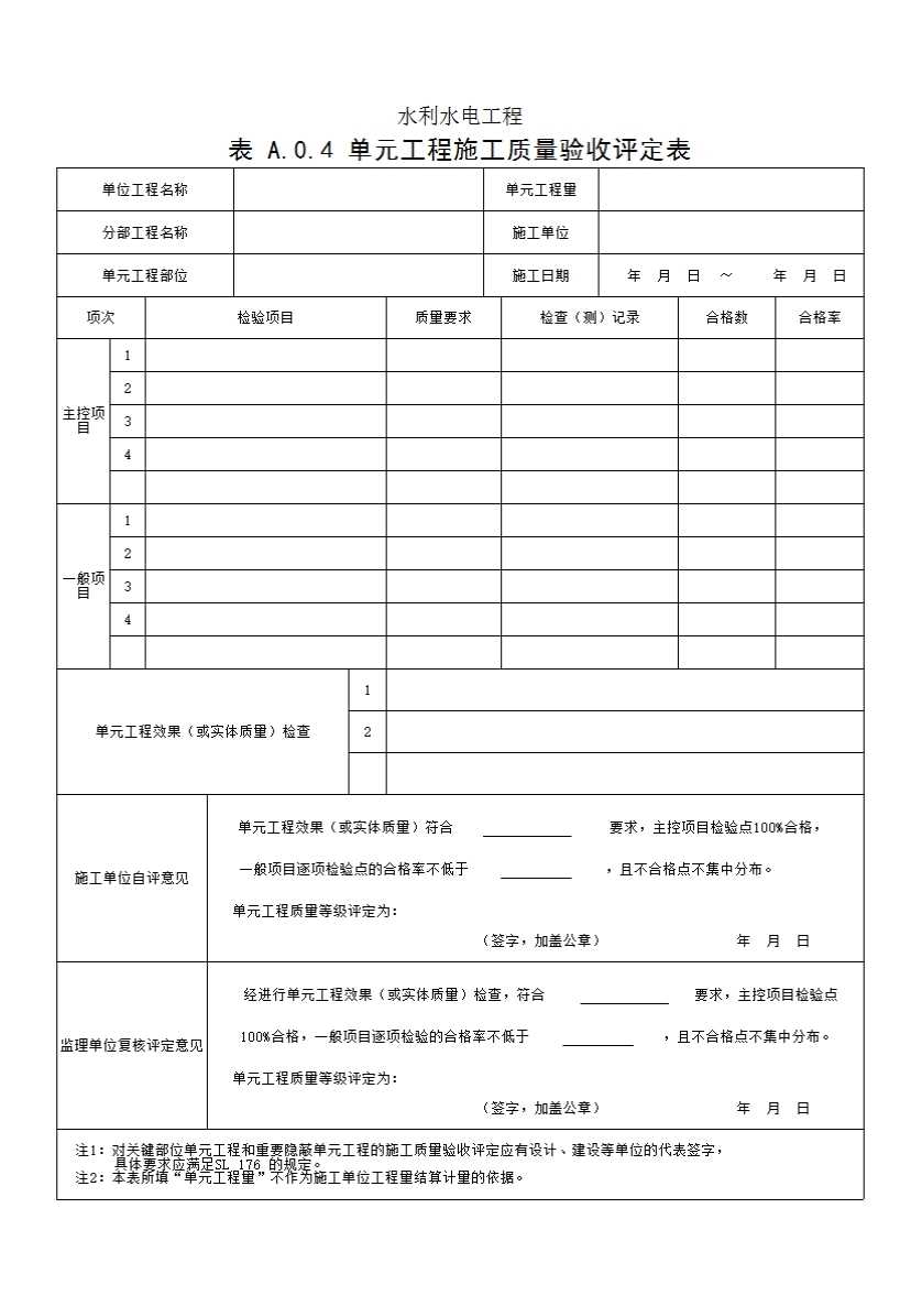 表格名称:表 A.0.4 单元工程施工质量验收评定表