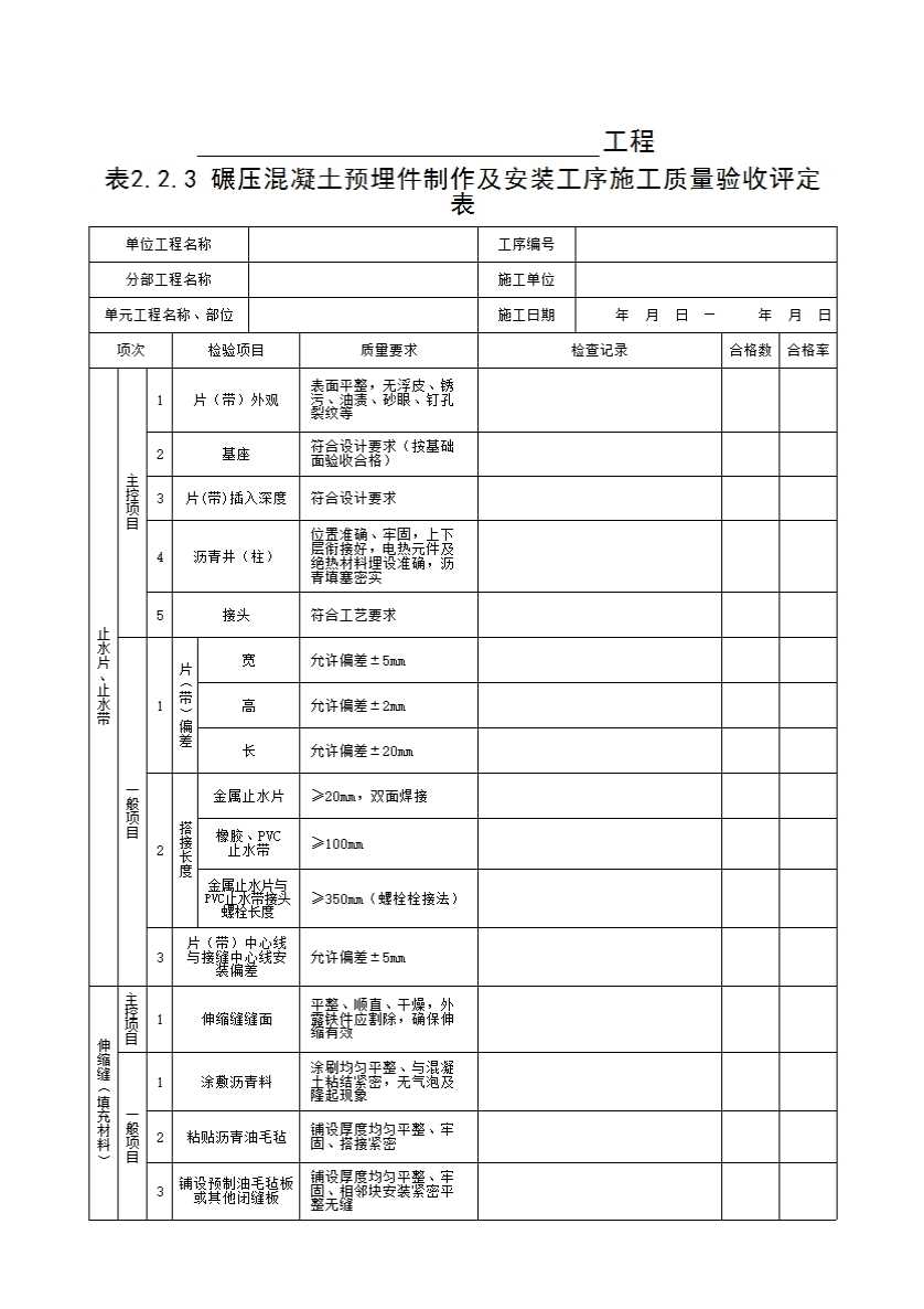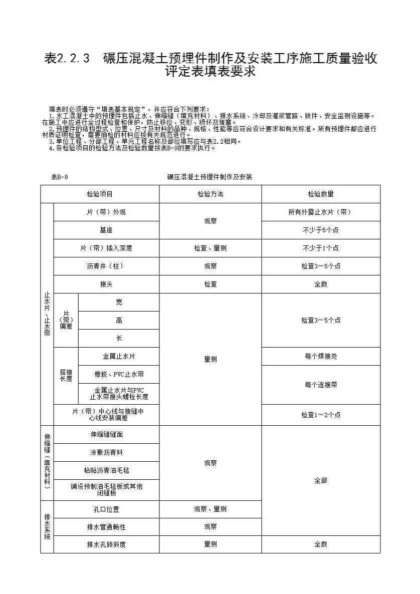 表2.2.3 碾压混凝土预埋件制作及安装工序施工质量验收评定表填表要求