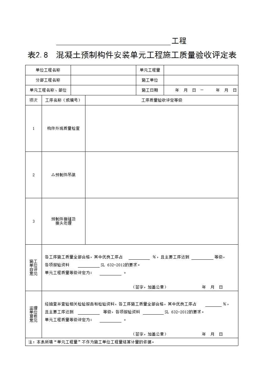 表2.8 混凝土预制构件安装单元工程施工质量验收评定表