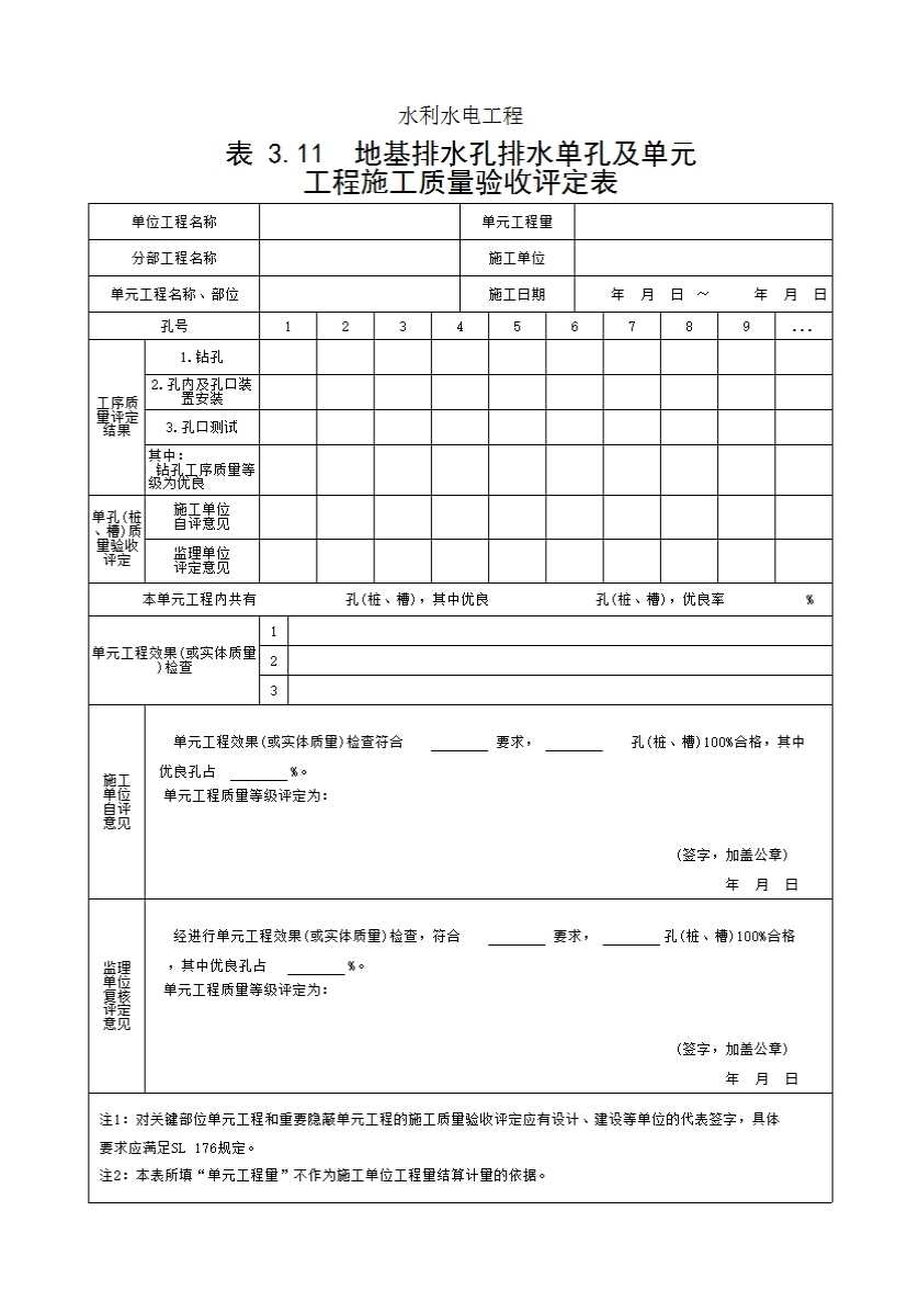 表3.11 地基排水孔排水单孔及单元工程施工质量验收评定表