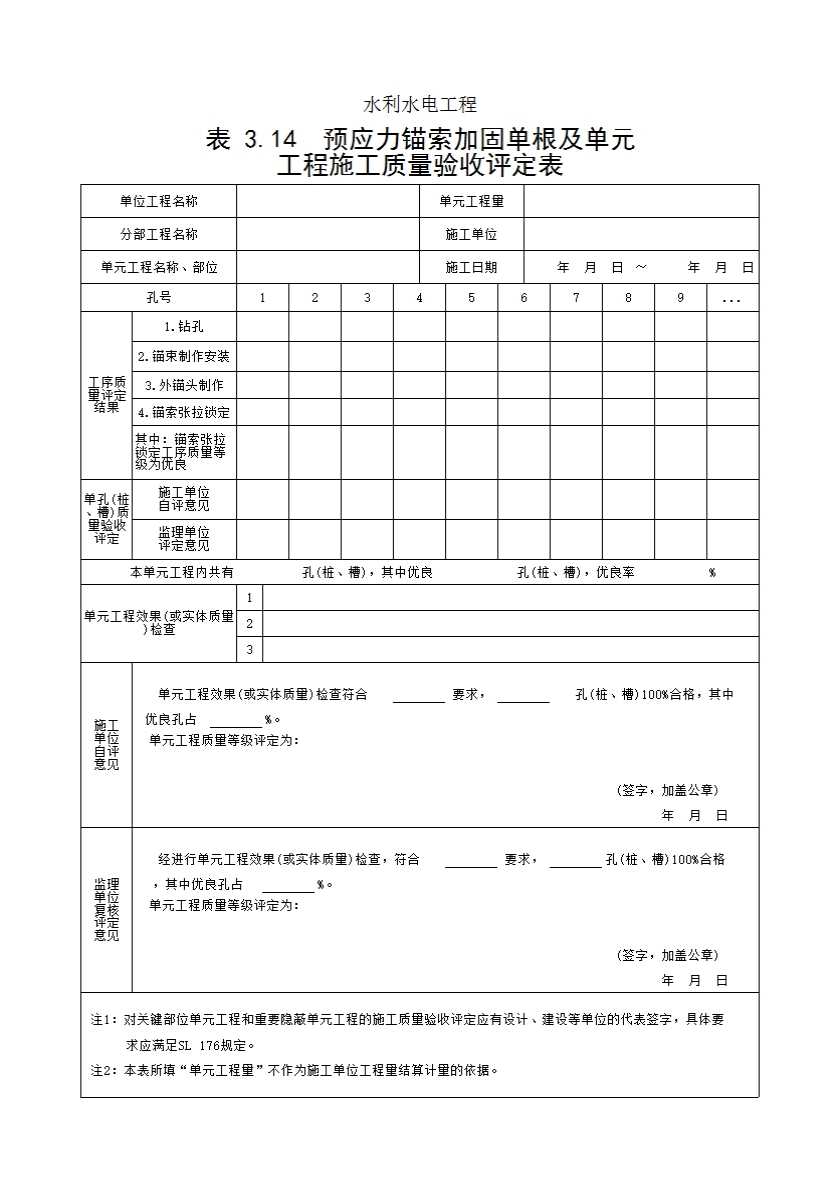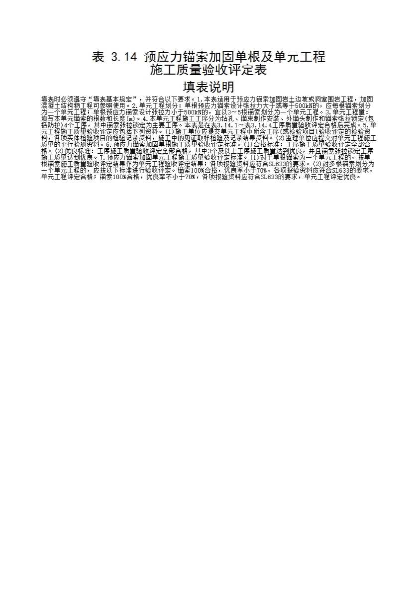表格名称:表3.14 预应力锚索加固单根及单元工程施工质量验收评定表